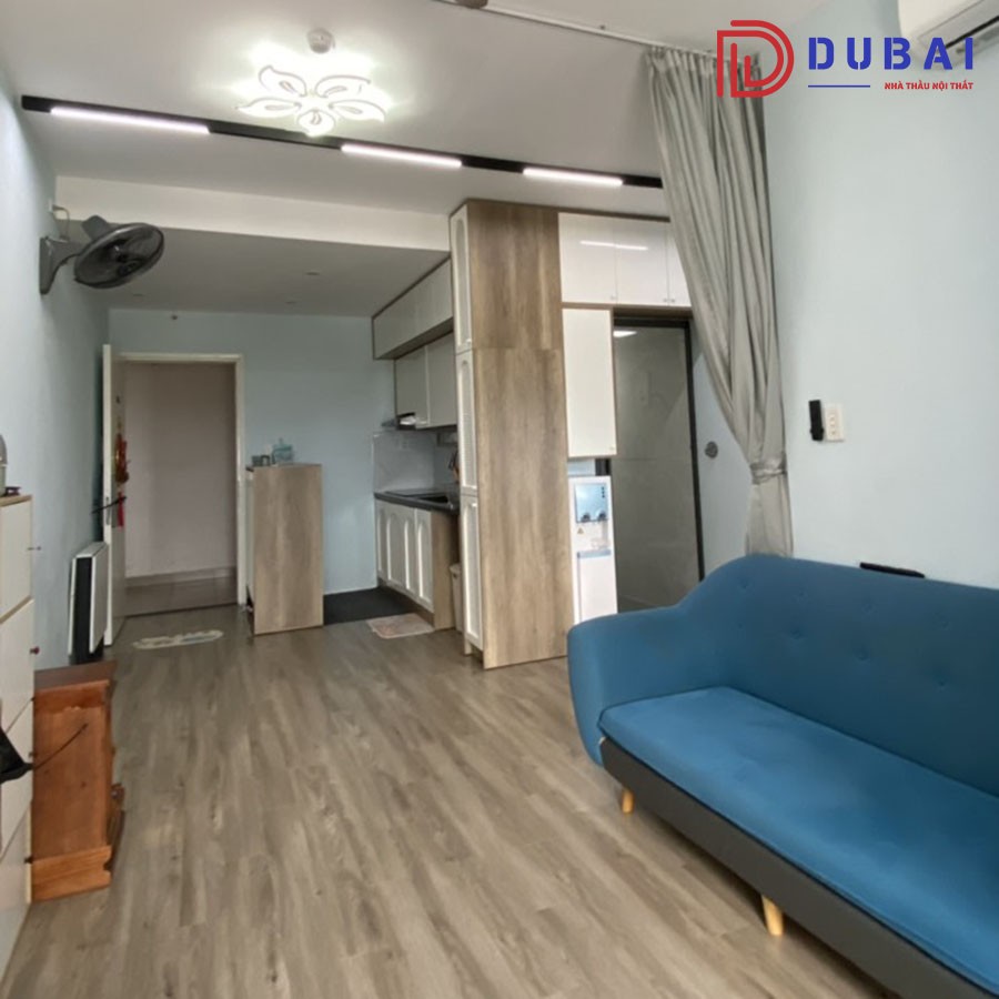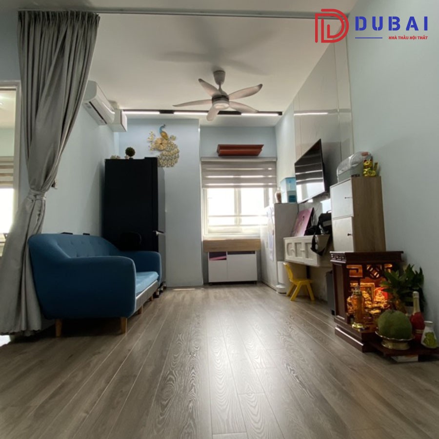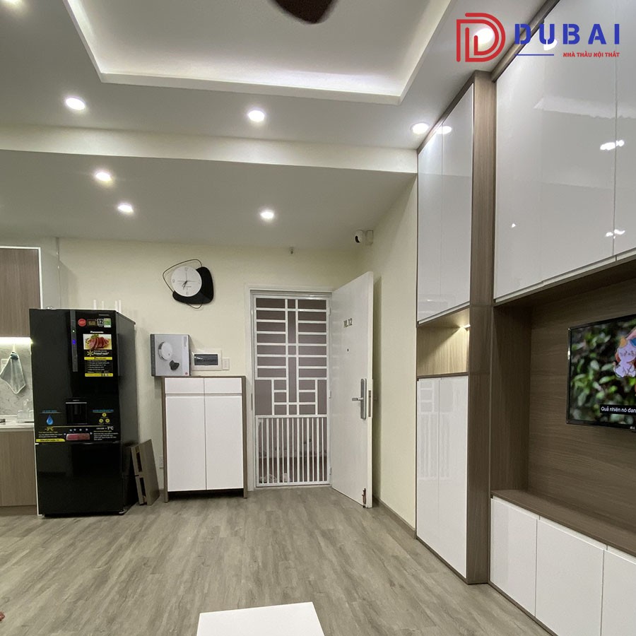 Sau khi hoàn tất việc lựa chọn vật liệu và thiết kế, đội ngũ thi công của Nội Thất DUBAI bắt đầu tiến hành lắp đặt các sản phẩm nội thất. Tủ tivi được thiết kế với các ngăn kệ tiện dụng để dễ dàng chứa đựng các thiết bị điện tử và đồ trang trí, đồng thời tạo điểm nhấn cho không gian. Bàn phòng khách được lựa chọn kiểu dáng hiện đại, vừa phù hợp với không gian nhỏ gọn của chung cư, vừa mang lại cảm giác thoải mái cho gia đình khi tiếp đón khách.