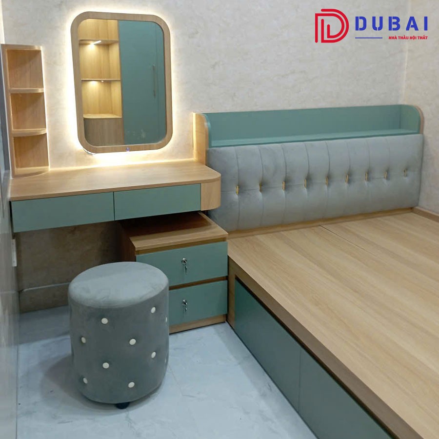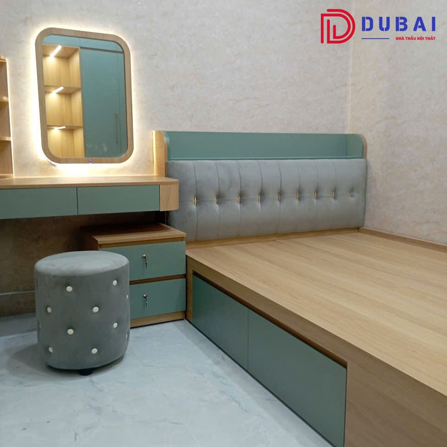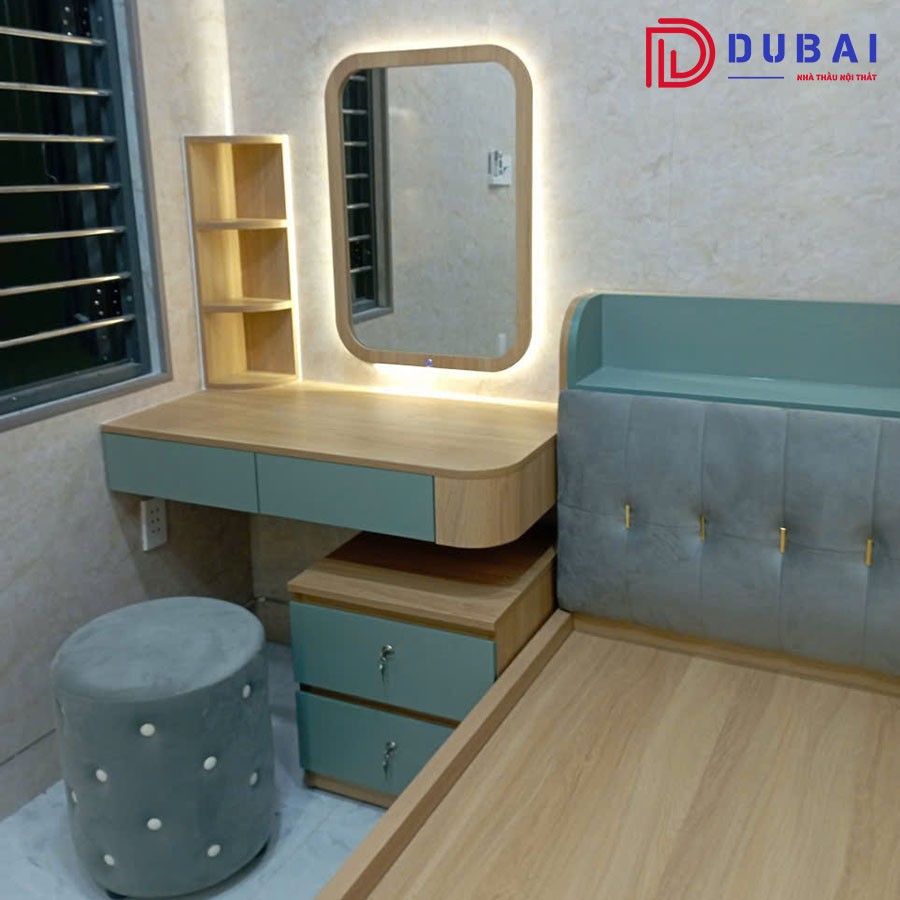 Dự án thi công nội thất phòng ngủ tại Đức Phổ, Quảng Ngãi được thực hiện bởi Nội Thất DUBAI, một đơn vị thi công uy tín trong lĩnh vực thiết kế và thi công nội thất. Với mục tiêu mang lại không gian sống hiện đại, sang trọng, công trình bao gồm ba hạng mục chính: bàn trang điểm, tủ quần áo, và giường ngủ, được thiết kế tinh tế với màu sắc chủ đạo xanh ghi và vàng.