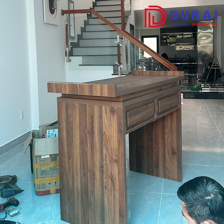 Sau khi các sản phẩm đã được sản xuất xong, đội ngũ thi công của Nội Thất DUBAI bắt đầu vận chuyển và lắp ráp tại công trình. Đặc biệt, trong quá trình lắp ráp, đội ngũ thi công luôn chú trọng đến từng chi tiết nhỏ, từ việc căn chỉnh bàn thờ sao cho đúng hướng phong thủy đến việc lắp đặt các chi tiết trang trí.