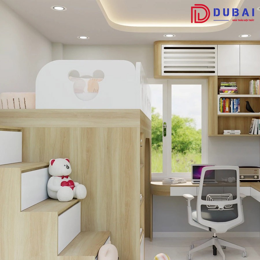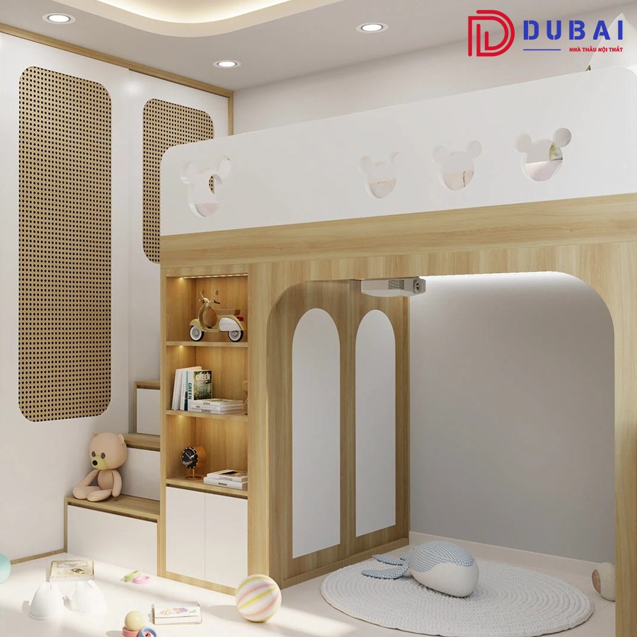 ♦ Phong cách: Giường Tầng Gỗ Công Nghiệp MDF GT-12 từ Nội Thất DUBAI, sản phẩm này mang đậm phong cách hiện đại, dễ thương và tiện dụng, với thiết kế hài hòa giữa màu gỗ tự nhiên và các chi tiết trang trí dễ thương. Các cửa sổ hình tròn dễ thương, cầu thang kiểu mới kết hợp với các ngăn lưu trữ thông minh tạo nên không gian thoải mái và đầy sáng tạo cho trẻ em.