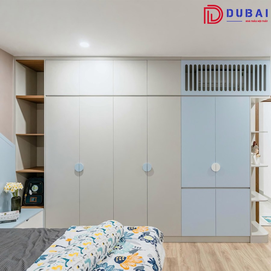 ♦ Phong cách: Phòng ngủ này theo phong cách hiện đại, tối giản với tông màu chủ đạo là xanh dương, xanh lá và trắng, tạo ra một không gian nhẹ nhàng, dễ chịu. Mẫu thiết kế này kết hợp giữa sự tinh tế và tính thực dụng, phù hợp cho các bé trai. Các chi tiết như kệ sách, bàn học và giường ngủ đều có hình dáng đơn giản, gọn gàng nhưng không thiếu phần bắt mắt.