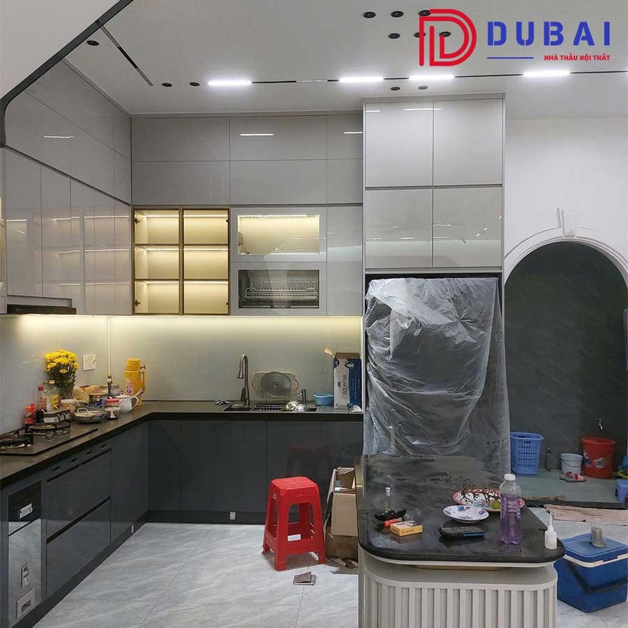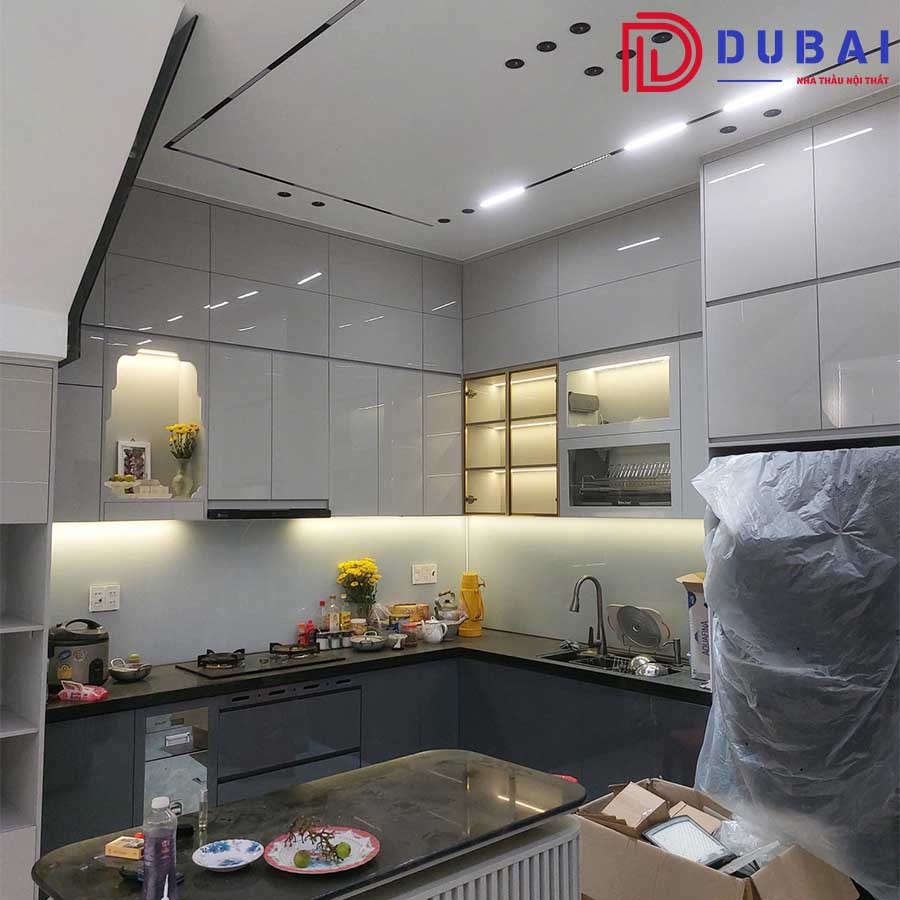 ♦ Phong cách: Lý tưởng cho nhà phố, căn hộ có trần cao, bếp liên thông phòng khách hoặc bếp đặt dưới gầm cầu thang. Cũng hợp nhà ở mới, gia chủ đề cao sự ngăn nắp và thích vẻ sang hiện đại.