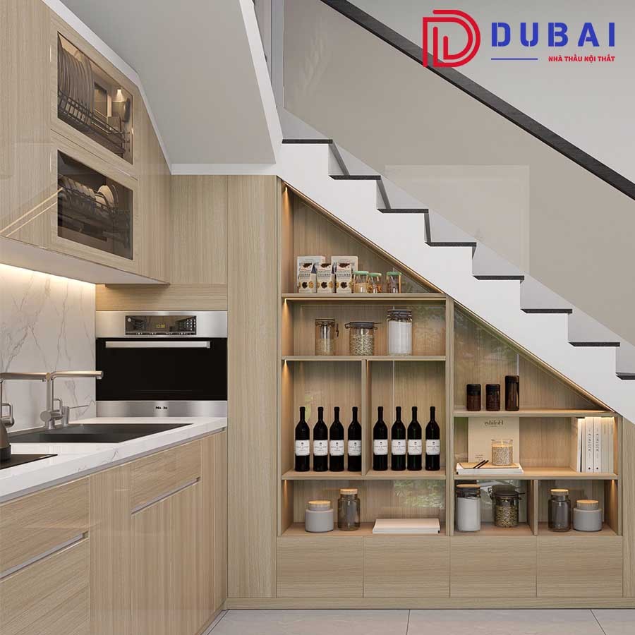 ♦ Phong cách: Lý tưởng cho nhà phố cầu thang giữa, bếp liên thông phòng khách, các không gian nhỏ. Cũng phù hợp homestay/condotel hoặc căn hộ cho thuê dài hạn: gọn, sáng, dễ vệ sinh, có kệ mở trưng bày/mini bar dưới gầm thang.