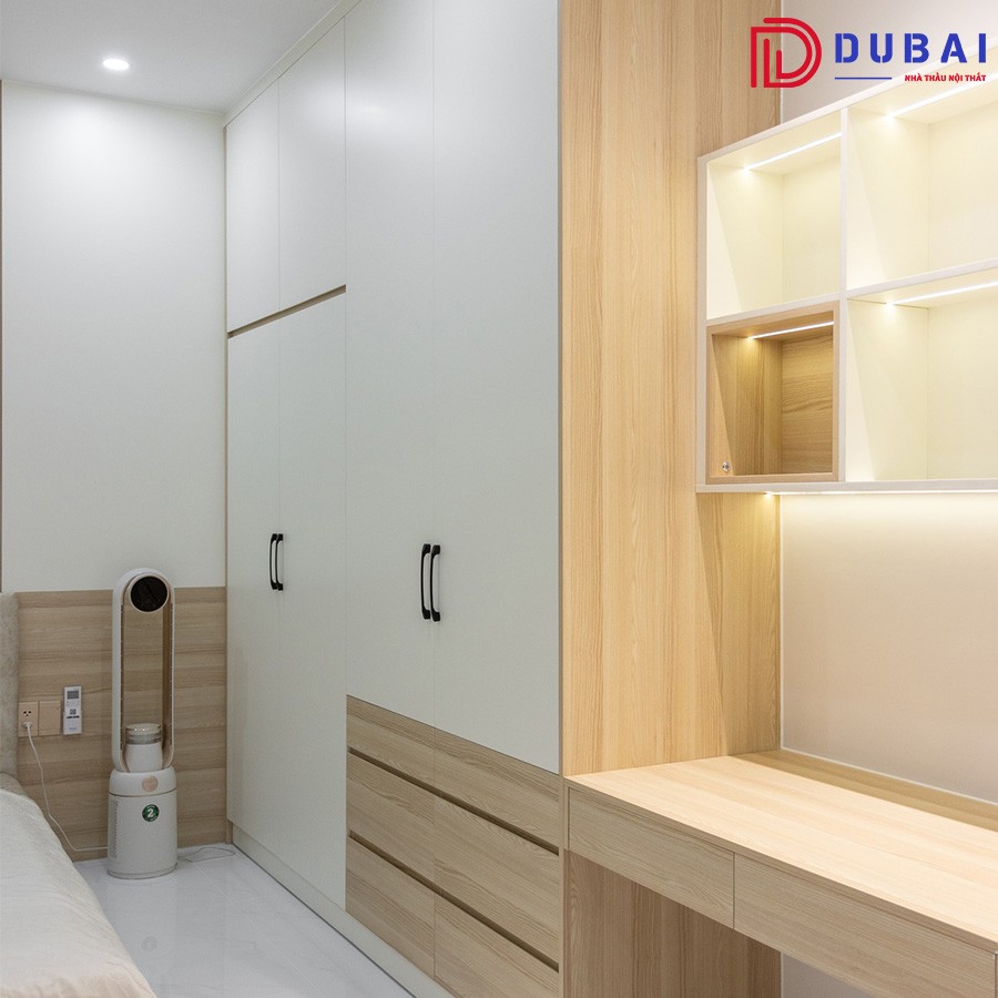 ♦ Phong cách: Không gian phù hợp nhất là phòng ngủ chung cư hoặc nhà phố diện tích nhỏ–vừa, hoặc phòng ngủ có góc học tập/làm việc cũng đặc biệt hợp với bố cục bàn liền tủ này.